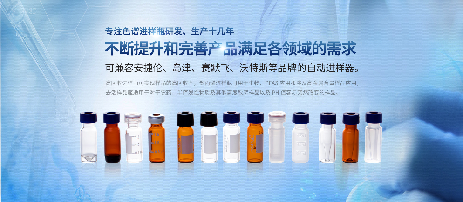 浙江哈邁科技有限公司(簡稱HAMAG),成立于2005年,總部位于美麗的海濱城市寧波,是中國優(yōu)質(zhì)色譜進(jìn)樣瓶、樣品瓶供應(yīng)商,是一家專業(yè)從事色譜耗材的科研、設(shè)計(jì)、生產(chǎn)、銷售和系統(tǒng)集成為一體的生產(chǎn)型企業(yè)。經(jīng)過十幾年的研發(fā)與努力,通過和國內(nèi)外多個(gè)科研部門,浙江大學(xué)理工學(xué)院,同時(shí)與品牌:安捷倫、沃特世、島津等公司的技術(shù)交流與學(xué)習(xí),我們成功的研制開發(fā)出實(shí)驗(yàn)室分析設(shè)備專用的各種型號(hào)的自動(dòng)進(jìn)樣瓶、頂空瓶及其配套蓋墊;特氟龍與硅膠復(fù)合墊片;特氟龍/硅膠制品;創(chuàng)新型固相萃取儀;針式過濾器等幾十種實(shí)驗(yàn)室耗材及關(guān)聯(lián)產(chǎn)品...